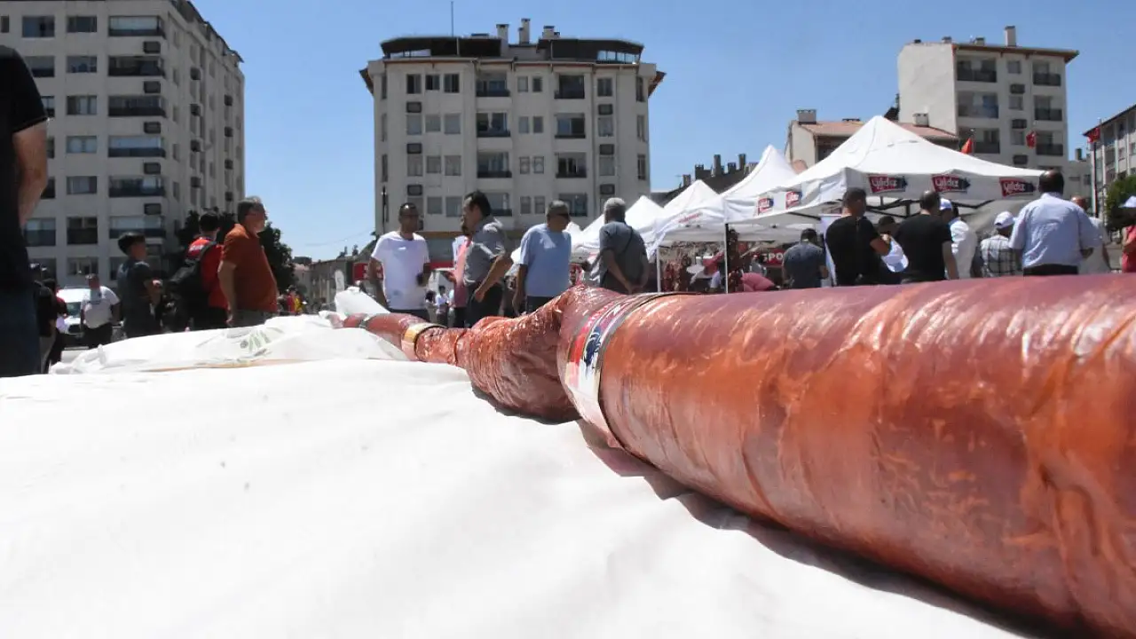 SİVAS'ta dün başlayan Gardaşlık Festivali kapsamında Sivas sucuğunun tanıtımı yapıldı. İl plakası olan 58 metre uzunluğunda üretilen sucuk, il protokolü ve esnaf tarafından kesilerek vatandaşlara ikram edildi.