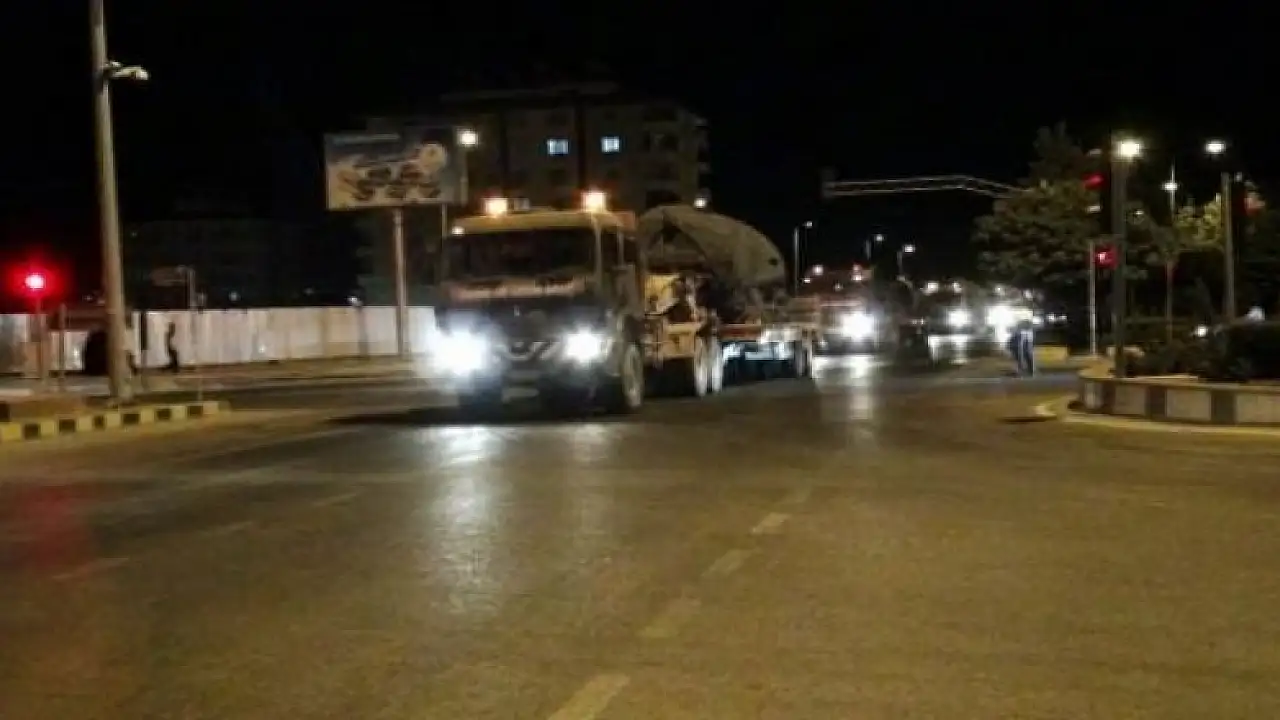 Batı kentlerindeki birliklerden sevk edilen fırtına obüsleri ile tankları taşıyan askeri konvoy, gece saatlerinde Kilis'e ulaştı.