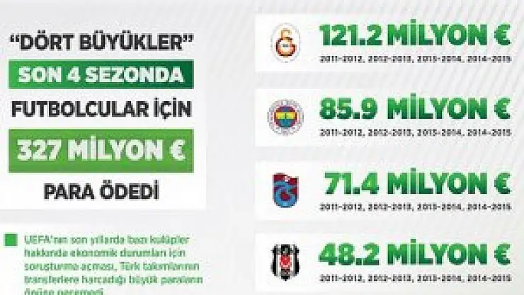 Türkiye'de "Dört büyükler" olarak adlandırılan Galatasaray, Fenerbahçe, Beşiktaş ve Trabzonspor, son 4 sezonda transfer ettiği veya kiralık olarak renklerine bağladığı futbolcular için toplam 327 milyon avro para ödedi.