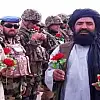 Sosyal medyaya yansıyan görüntülerde, militanların Afgan askerlerine çiçek verdiği yer alıyor.
