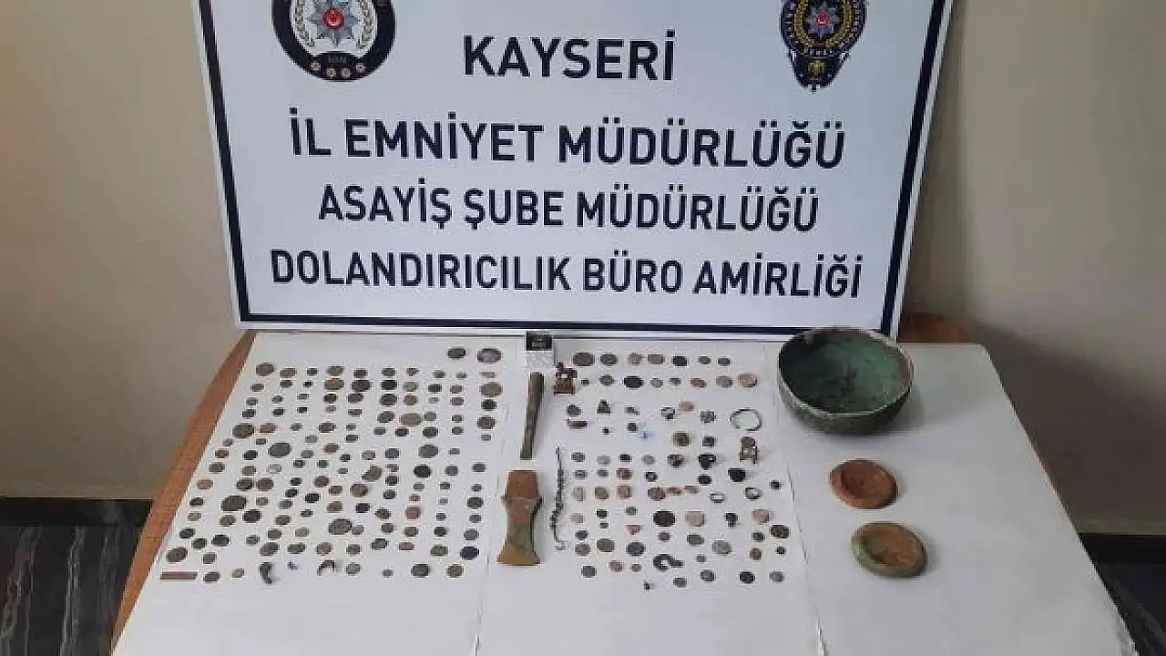 Edinilen bilgiye göre, Kayseri İl Emniyet Müdürlüğü Asayiş Şube Müdürlüğü'ne bağlı Güven Timleri, Cumhuriyet Mahallesi ve bağlı ara sokaklarda şüpheli şahıslara yönelik uygulama yaptı. Ekipler, yapılan uygulamada S.A. (31), M.S. (29) ve yabancı uyruklu N.M.'nin (22) üzerinde arama yaptı. Yapılan aramada şahısların üzerinden tarihi eser olduğu değerlendirilen çok sayıda sikke ve takı benzeri objeler ele geçirildi.