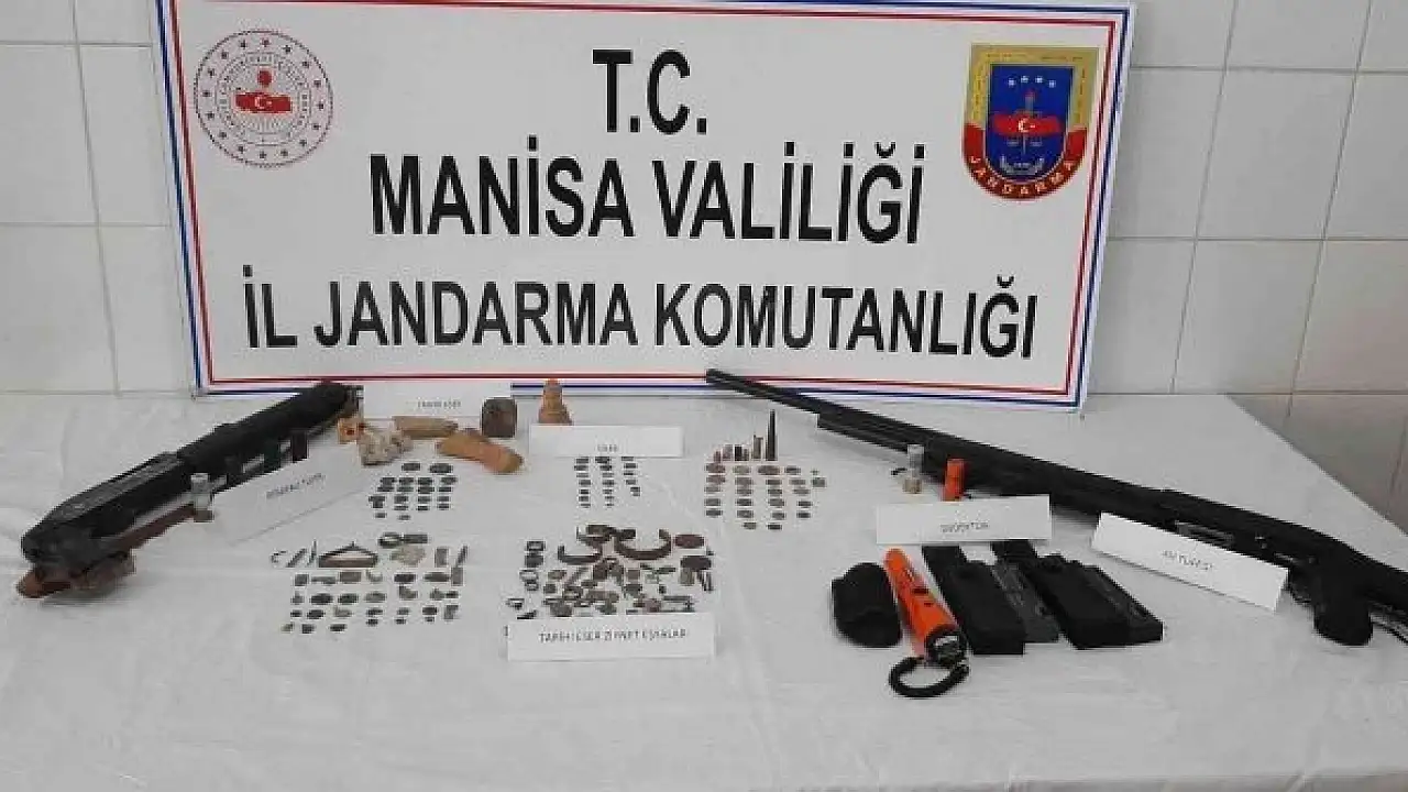 Demirci ilçesi Üşümüş Mahallesi'nde S.E. (47) isimli şahsın elindeki tarihi eser niteliğindeki objeleri satmak için müşteri aradığı bilgisi üzerine harekete geçen Demirci İlçe Jandarma Komutanlığı KOM Şube Müdürlüğü ve İstihbarat Şube Müdürlüğü ekipleri, saat 17.00 sıralarında şahsın ikametine baskın yaptı. İkamet ve eklentilerinde yapılan aramada 1 adet bilezik, 2 adet Osmanlı tuğralı plaka, 56 adet metal sikke, 44 adet tarihi eser niteliği taşıyan yüzük, küpe, mızrak ucu benzeri malzeme, 3 adet dedektör, 6 adet tarihi eser niteliği taşıdığı değerlendirilen taş, 30 adet tarihi eser niteliği taşıyan eski para, 2 adet av tüfeği ele geçirildi. Gözaltına alınan şüphelinin jandarmadaki işlemlerinin devam ettiği öğrenildi.