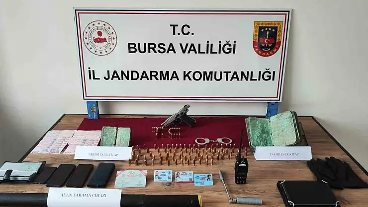 İnegöl İlçe Jandarma Komutanlığı ekipleri, şüpheli hareketler sergileyen bir aracı durdurdu. Araçta yapılan detaylı aramada; 2 adet tarihi eser niteliğinde kitap, 1 adet Sarsılmaz marka tabanca, 123 adet 45 kalibrelik tabanca mermisi, 1 adet kelepçe, 1 adet el telsizi, 1 adet tablet, 4 adet cep telefonu, 29 bin 800 lira nakit para, 4 adet "Polis" ibareli sahte basın kartı ile alan tarama ve yeraltı görüntüleme cihazları ele geçirildi.