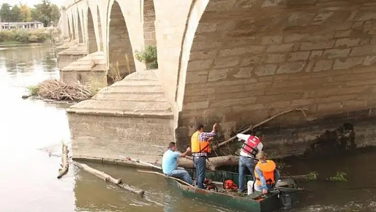 Edirne'deki tarihi Meriç Köprüsü'nün ayaklarında biriken ağaç dallarıtemizlendi.