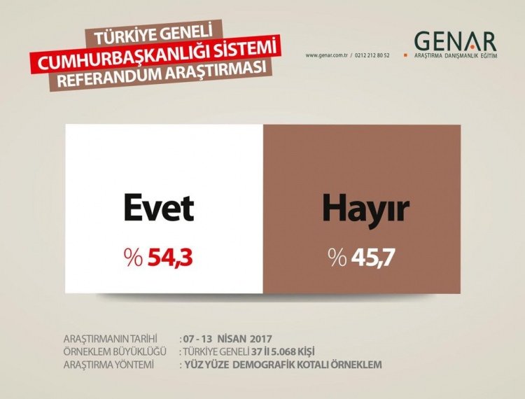 GENAR'ın 07 - 13 Nisan tarihleri arasında 37 ilde 5 bin 68 kişiyle yüz yüze yaptığı araştırmaya göre: Evet oyları: % 54,3 Hayır oyları ise: % 45,7 olarak hesaplandı.