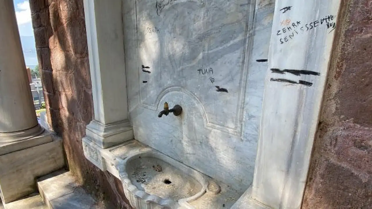 Tarihi saat kulesini altındaki çeşmelere zarar verip, yazı yazdılar