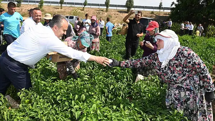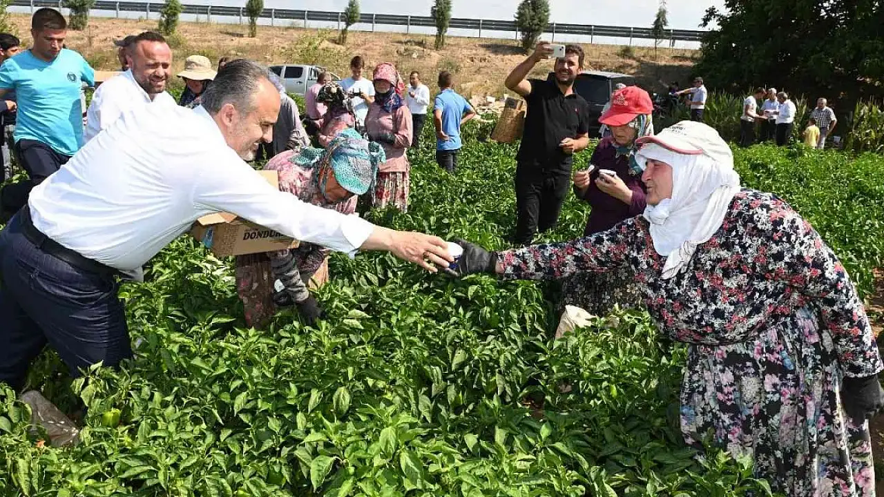 Bursa Büyükşehir Belediye Başkanı Alinur Aktaş, Yenişehir'de biber hasadı yapan çiftçileri ziyaret ederek, dondurma ikramında bulundu.
