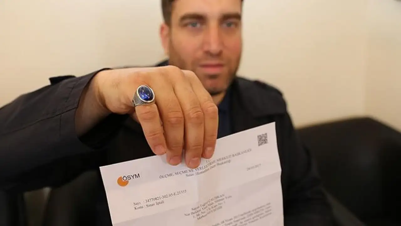Nevşehir'de yaşayan din görevlisi Çalışkan (36), 8 Nisan'da Kayseri'de Diyanet İşleri Başkanlığı Mesleki Bilgiler Seviye Tespit Sınavı'na katıldı. Heyecanla sınav sonucunu bekleyen Çalışkan'a ÖSYM Sınav Hizmetleri Daire Başkanı Süleyman Şenocak imzalı sınava taşlı yüzükle katıldığı gerekçesiyle sınavının iptal edildiğini belirten belge ulaştı.