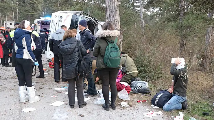 BOLU'da, Kartalkaya kayak merkezinden dönen tatilcilerin taşındığı minibüsün keskin virajda sürücüsünün kontrolünden çıkarak devrildiği kazada, araçta bulunan 19 yolcudan 14'ü yaralandı.