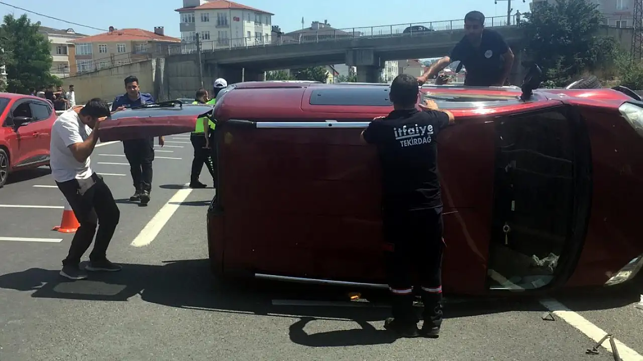 Kaza, Çerkezköy Tugay Kavşağı'nda meydana geldi. Samsun'da tatil yapıp, Tekirdağ'ın Kapaklı ilçesine dönüşe geçen 5'ü çocuk 7 kişilik ailenin içinde bulunduğu 59 TG 678 plakalı hafif ticari araç, baba Abdurrahman Aydoğdu'nun kontrolden çıkıp, yan yattı. Kazada sürücü, eşi Aygül, çocukları F.A., Y.A., Y.E.A. S. A. ve F.A., yaralandı. Yaralılar, ambulanslarla Çerkezköy Devlet Hastanesi'ne kaldırıldı. Kazaya ilişkin soruşturma başlatıldı. (DHA)