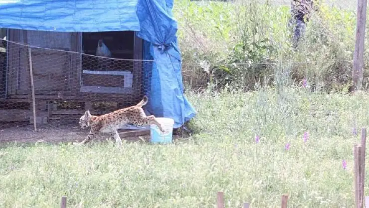 Bolu'da süs tavuğu beslenen çiftliğe inen vaşak, ekiplerin yarım saatlik çalışması neticesinde balıkçı ağıyla yakalanarak koruma altına alındı.