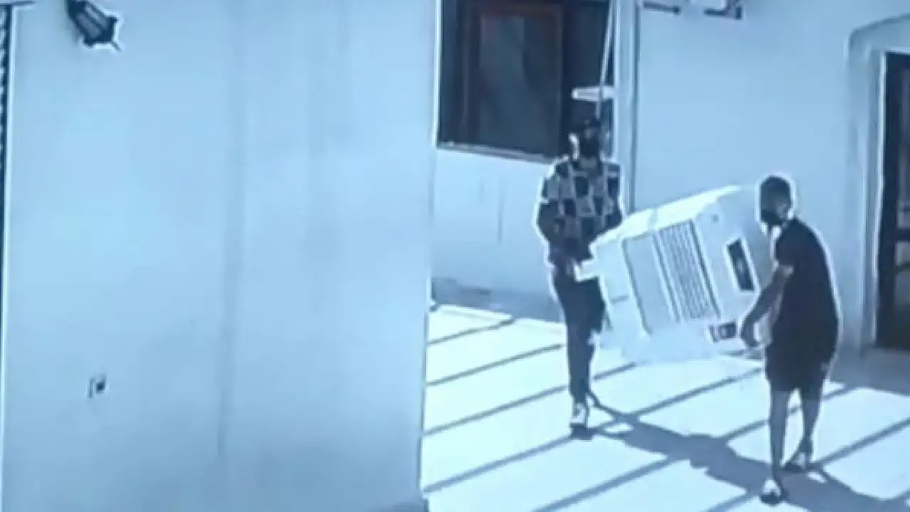 MARDİN'in Nusaybin ilçesinde, taziye evinin sulu klimasının 2 hırsızlık şüphelisi tarafından çalınma anı, güvenlik kamerasına anbean yansıdı.