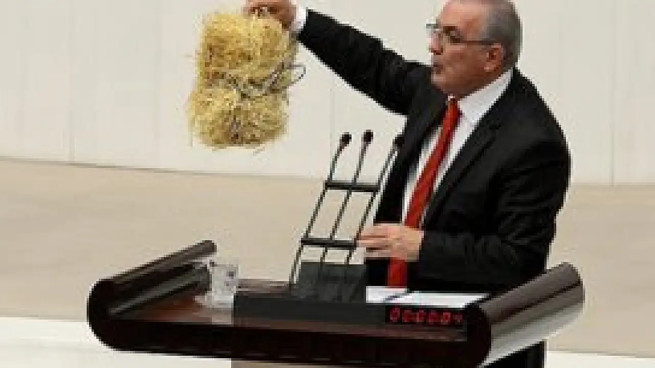Gündemdışı söz alan CHP Ardahan Milletvekili Ensar Öğüt, Genel Kurul'da kürsüye elinden paketlerle çıktı. "Hükümete köylünün gönderdiği sevgililer günü hediyesi. Altın değerindedir. Bunu, hükümetin masasına, protesto etmek için sunacağım" diyen Öğüt, hükümetin saman yerine sap ithal ettiğini, üreticilerin hayvanlarına bunları yediremediğini savundu ve eleştirilerde bulundu.