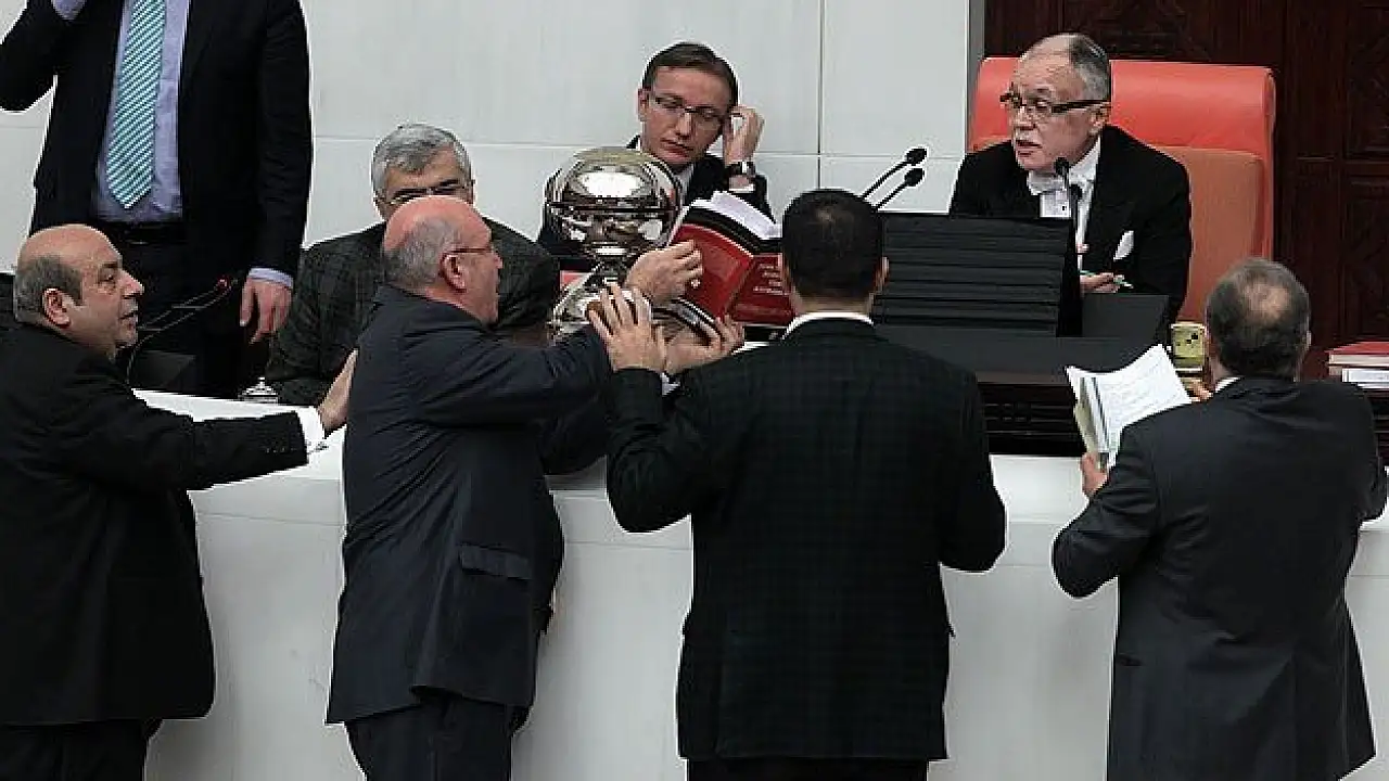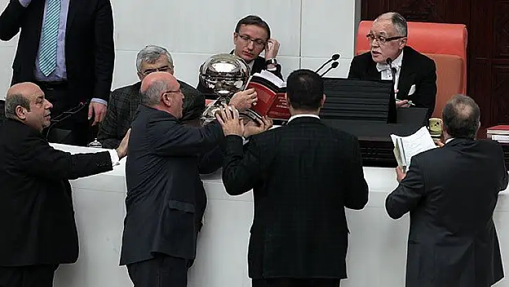 Divandaki AK Partili katip üye Bayram Özçelik'in 11. maddeye ilişkin önergeleri okumaya başlaması üzerine HDP milletvekilleri divan önüne gelerek itirazlarını sürdürdüler. Bu sırada HDP Hakkari Milletvekili Adil Zozani, Özçelik'in önündeki mikrofonu itti. Bazı milletvekileri de sıralara vurarak duruma tepki gösterdi.
