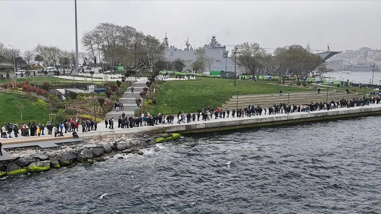 Türk donanmasının hizmetine 10 Nisan'da giren Türkiye'nin en büyük askeri gemisi TCG Anadolu'yu ziyaret etmek isteyen vatandaşlar, Sarayburnu Limanı'ndan Ahırkapı'ya kadar kuyruk oluşturdu.