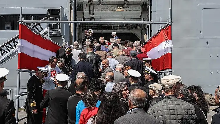 Geminin askeri görevlileri tarafından içeri alınan vatandaşlar, günün anısına hatıra fotoğrafı çektirdi.
