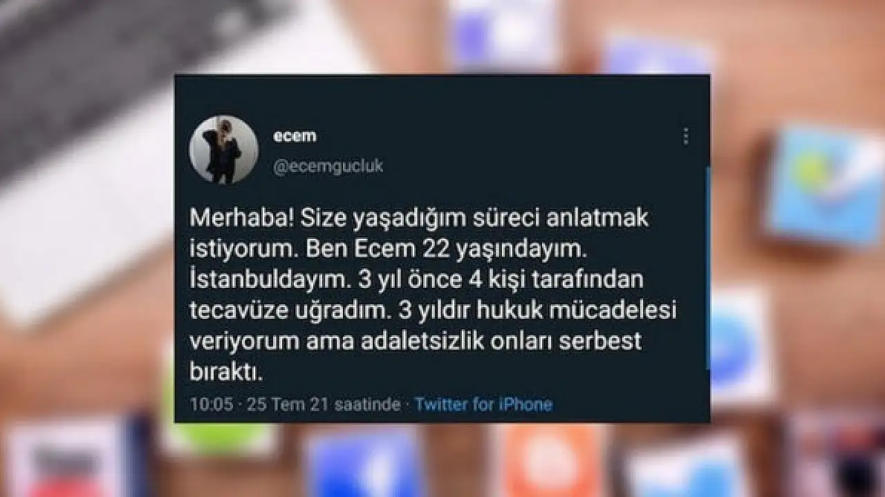 Ecem Güçlük, yaptığı paylaşımda 22 yaşında olduğunu, İstanbul Sarıyer'de 3 yıl önce 4 kişi tarafından tecavüze uğradığını, 3 yıldır hukuk mücadelesi verdiğini ancak şahısların serbest bırakıldığını öne sürdü ve iddia ettiği süreci anlattı.