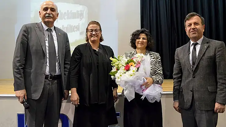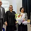 Karşılıklı soru-cevap etkinliğinin ardından okul yöneticileri, Prof. Dr. Nimet Ünlü’ye katılımlarından dolayı çiçek takdim ettiler.