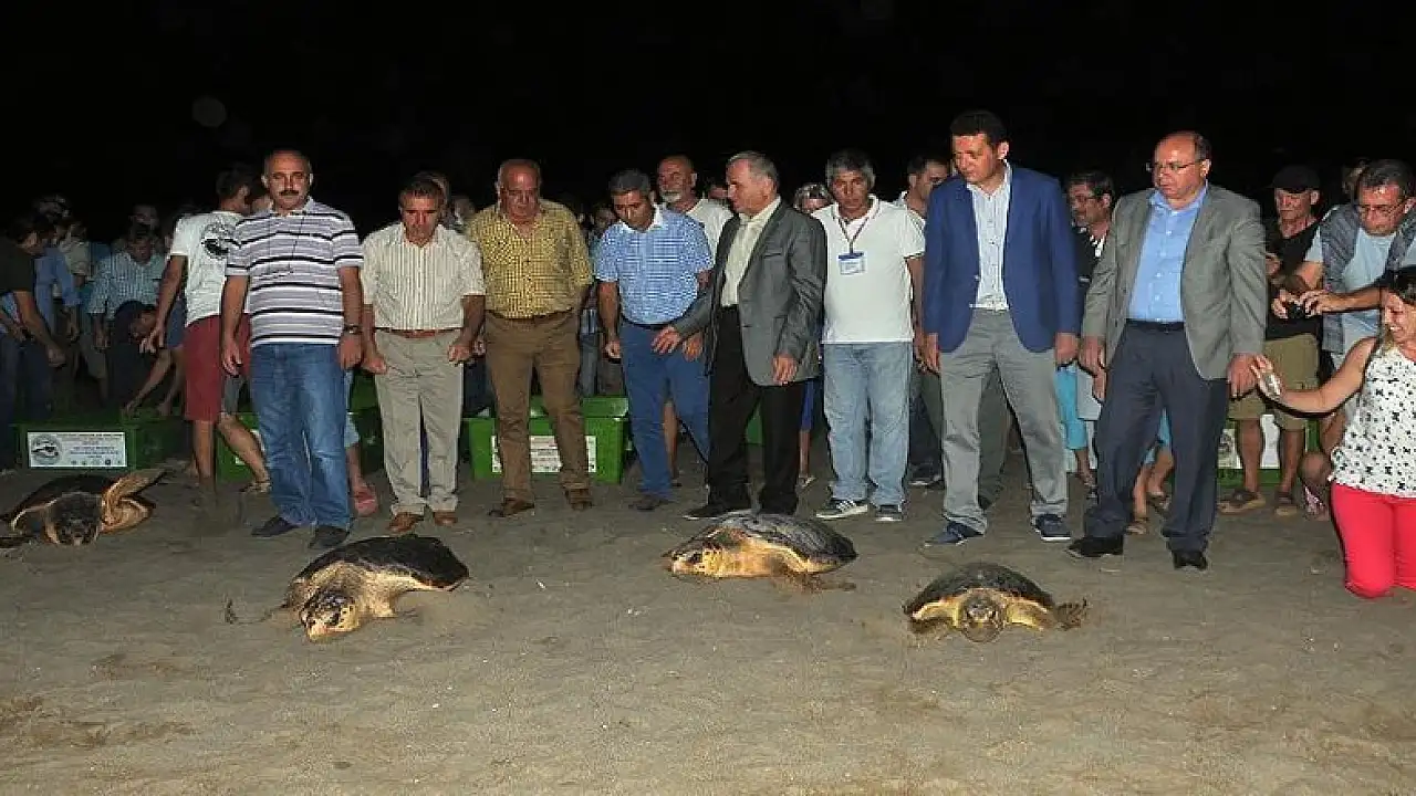 İztuzu sahilinde düzenlenen törende Deniz Kaplumbağası Araştırma Kurtarma Rehabilitasyon ve Bilgilendirme Merkezinde (DEKAMER) tedavileri tamamlanan caretta carettalar ve yavru deniz kaplumbağaları, denize bırakıldı.