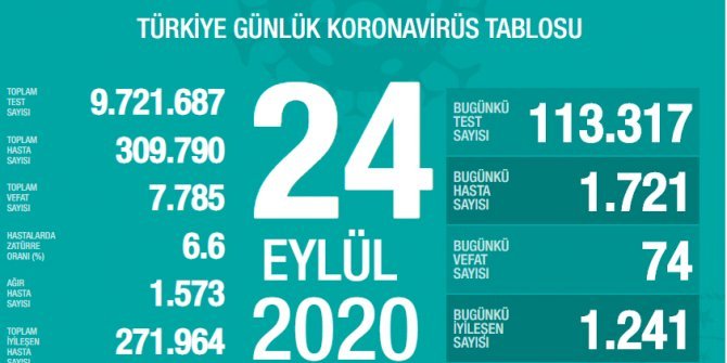 Bugünkü verilerle, toplam test sayısı 9 milyon 721 bin 687, toplam hasta sayısı 309 bin 790, toplam vefat sayısı 7 bin 785, hastalarda zatürre oranı yüzde 6,6, ağır hasta sayısı 1573, toplam iyileşen hasta sayısı 271 bin 964 oldu.