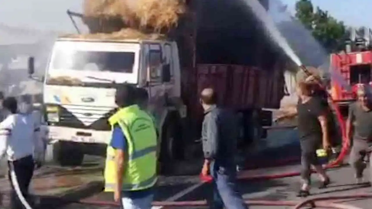 Tekirdağ'da saman yüklü kamyon seyir halindeyken alev aldı