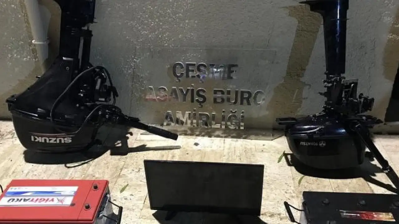 Edinilen bilgiye göre, Çeşme ilçesi Yıldızburnu'nda bağlı olan teknelerden; iki adet tekne motoru, iki akü ve bir televizyon çalındı. Çeşme İlçe Emniyet Müdürlüğü Asayiş Büro Amirliği ekipleri, hırsızlık olayı üzerine çalışma başlatırken, hakkında çok sayıda suç kaydı bulunan İ.B.'yi yakaladı. Şüpheliyi sorgulayan ekipler, aldıkları bilgi üzerine çok sayıda suç kayıtları bulunan A.B. ve B.K.'yı da gözaltına aldı. İki kişi, İzmir'in Konak ilçesinde çaldıkları malzemelerle birlikte yakalandı. Gözaltına alınan iki kişi, emniyete götürüldü.