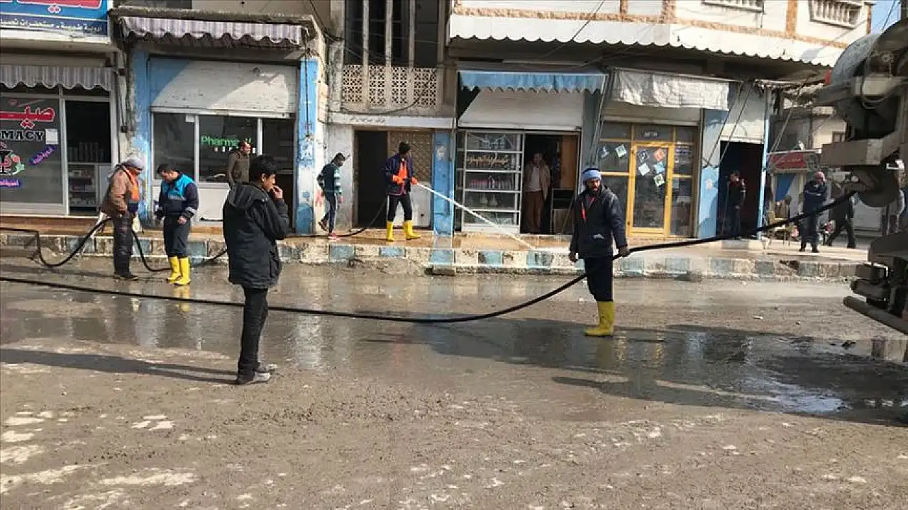Şanlıurfa Büyükşehir Belediyesi Su ve Kanalizasyon İdaresinin (ŞUSKİ) desteği ve Tel Abyad Yerel Meclisi'nin teşvikiyle ilçe halkının katlım sağladığı çalışmalarla yol ve kaldırımlar yıkanarak temizlendi.