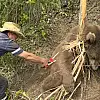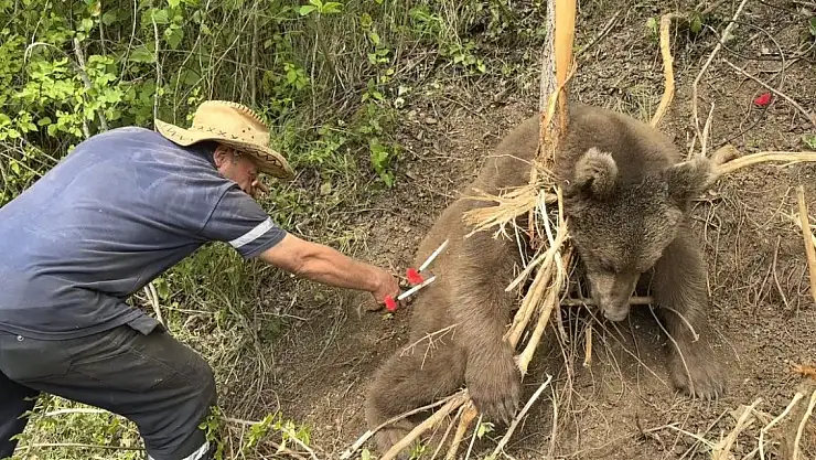 TRABZON'un Maçka ilçesinde indiği mahallede ayak ve pençeleri atıl haldeki çelik tele takılıp mahsur kalan bozayı, ekipler tarafından uyuşturucu iğneyle sakinleştirilip, kurtarıldı. Kurtarma anları kamerayla görüntülenen bozayı, doğaya bırakıldı.