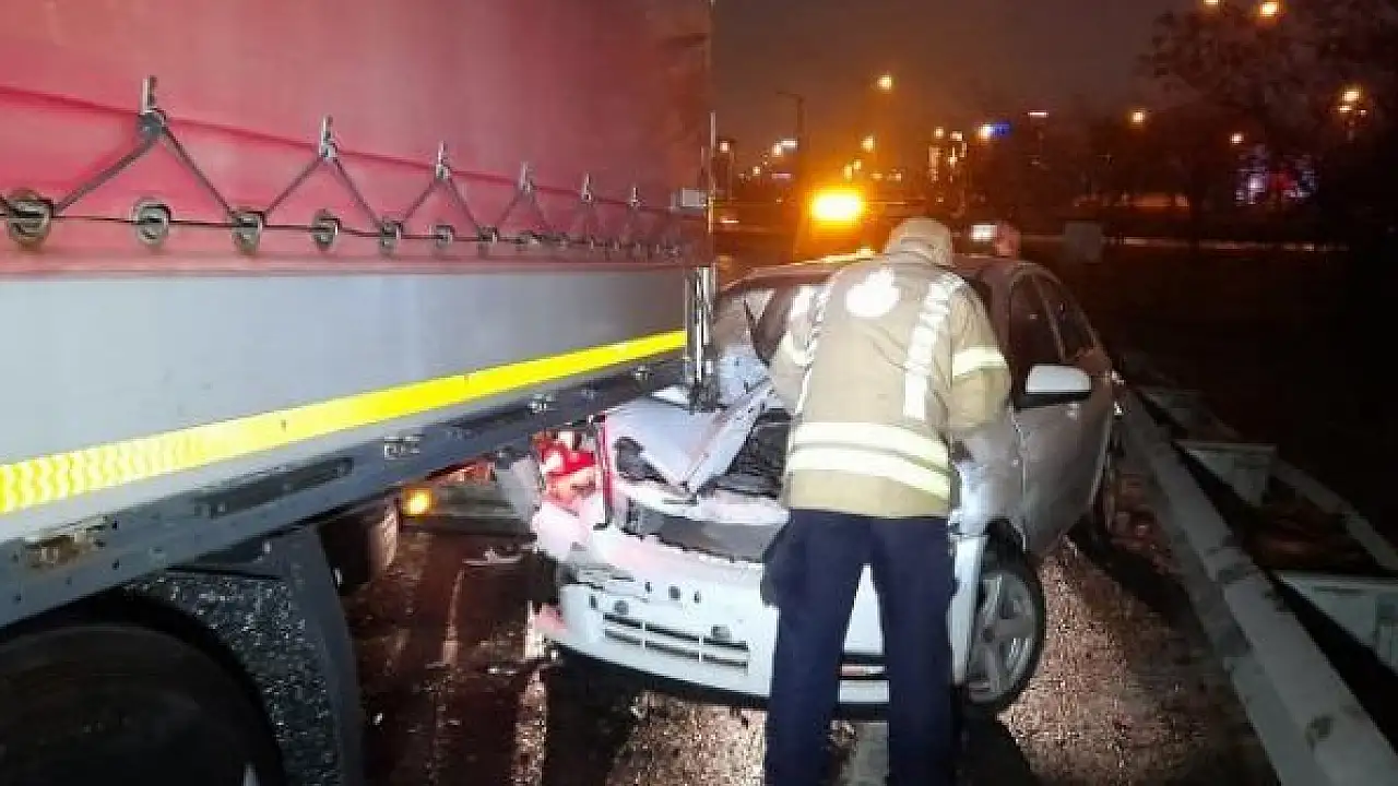 Çarpmanın etkisiyle otomobil tırın altına girdi. Araçta bulunan 3 kişi ise kazayı yara almadan atlattı.