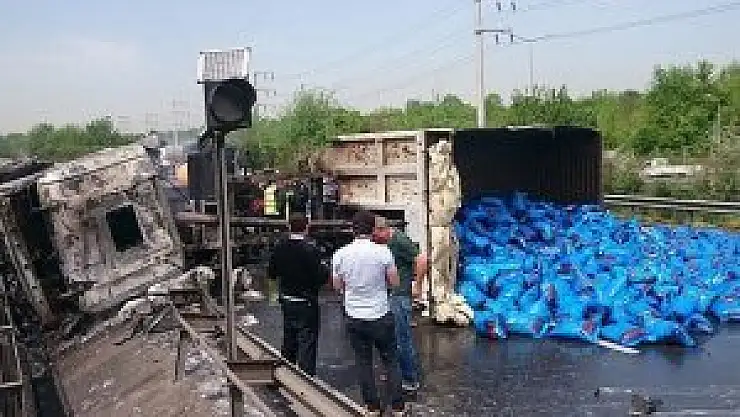 Kaza sonrası devrilerek alev alan kömür yüklü tırda sıkışan sürücü, yanarak yaşamını yitirdi.