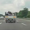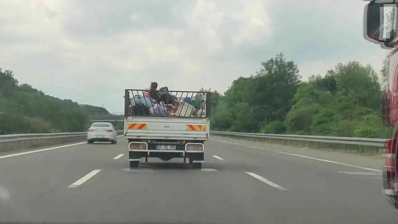 Akıcı trafiğin hakim olduğu, araçların 120 kilometre hızla gittiği TEM Otoyolu'nda, eşya yüklü kamyonet kasasında bulunan çocukların tehlikeli eğlencesi yürekleri ağıza getirdi. Neşesiyle hem yüz güldüren hem de korkutan çocuklar, vatandaşlar tarafından görüntülendi.