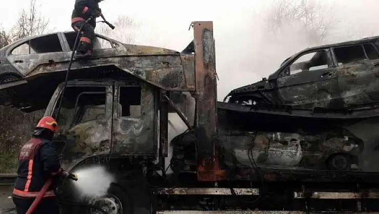 TEM Otoyolu Sakarya geçişinde 2'nci el araçları taşıyan tırda yangın çıktı. Kısa sürede alev topuna dönen tır ile dorsesinde taşıdığı 4 araç küle döndü. Araçların alev alev yandığı anlar ise saniye saniye kaydedildi.