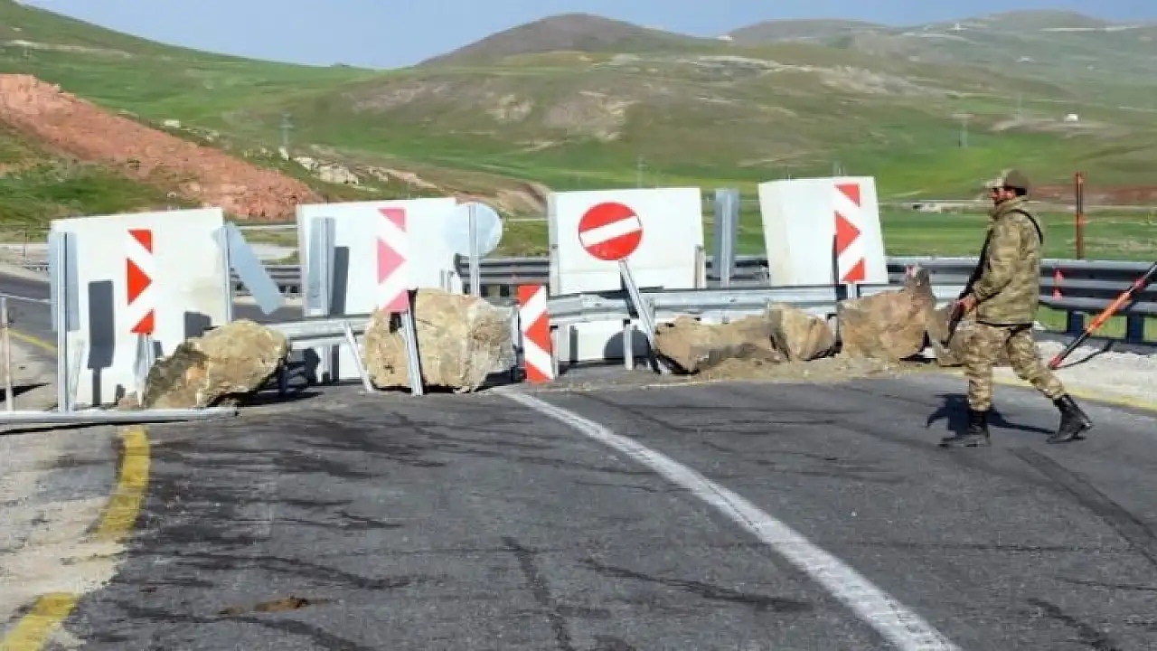 Karayolu beton bariyerlerle Gülizar Bölgesi'nde kapatılırken asker ve güvenlik korucuları bölgede kuş uçurtmuyor.