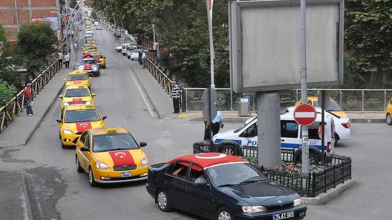 Bartın'da araçlarına Türk bayrağı asan taksi, halk otobüsü ve okul servisi şoförleri, konvoy oluşturarak, son günlerde artan terör olaylarını protesto etti.