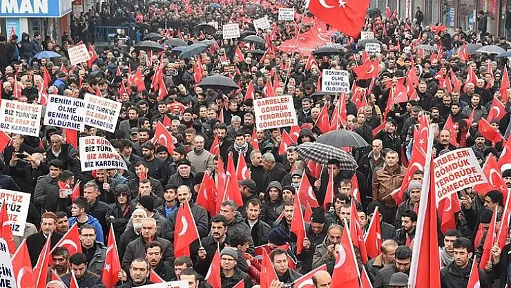 Soğuk ve yağışlı havaya rağmen binlerce vatandaş ellerinde Türk bayrakları ile terör örgütleri PKK, DEAŞ'ın hain saldırılarını lanetledi.