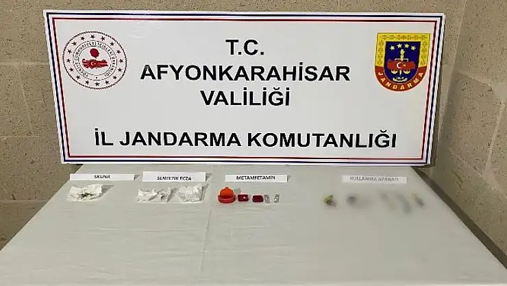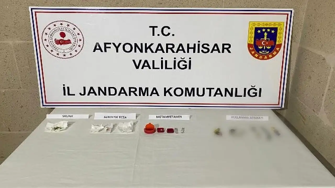 Edinilen bilgilere göre, Afyonkarahisar İl Jandarma Komutanlığı yapılan istihbari çalışmalar neticesinde, Afyonkarahisar ilinde ikamet eden I.D., Bursa'dan Afyonkarahisar araçla uyuşturucu madde getireceği yönünde bilgi elde etti. Şüpheli şahsın aracı, PTS üzerinden takibe alındı. Afyonakrahisar Yaylabağı yol kontrol noktasında durdurmak istenildiğinde, şahıs kullandığı araç ile ters istikamete dönerek kaçmak istedi. Bir süre yapılan takip sonucu araç emniyetli bir şekilde durduruldu. Adli makamlardan alınan arama kararına istinaden, şüphelinin üzerinde ve kullandığı araçta yapılan arama sonucunda; 13 gram metamfetamin, 3 adet sentetik ecza, 3 gram skunk, 6 adet uyuşturucu kullanma aparatı ele geçirildi. Ayrıca, şüpheli gözaltına alınırken, para cezası da uygulandı.