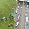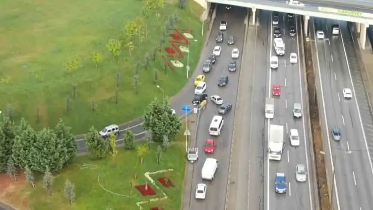 Kartal'da etkili olan yağış sonrası direksiyon hakimiyetini kaybeden sürücü yol üzerindeki aydınlatma direğine çarparak durabildi. Çarpmanın etkisiyle aydınlatma direği yola devrildi. Oluşan yoğun trafikten kaçmak isteyen araç sürücüleri ise ters yöne girerek trafiği tehlikeye attı. O anlar dron ile görüntülendi.