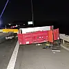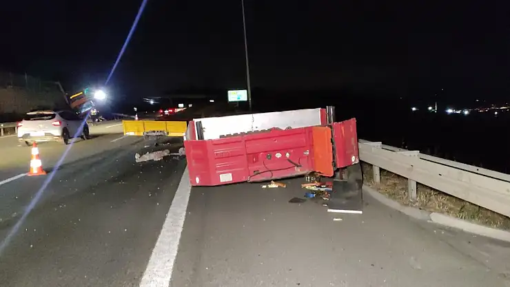 Gebze-Orhangazi-İzmir Otoyolu'nda kontrolden çıkan tır, 3 metre yükseklikten karşı şeride uçtu. Refüjde asılı kalan dorsenin parçaları yola savrulurken, kaza sırasında yolda araç bulunmaması büyük bir facianın önüne geçmiş oldu.