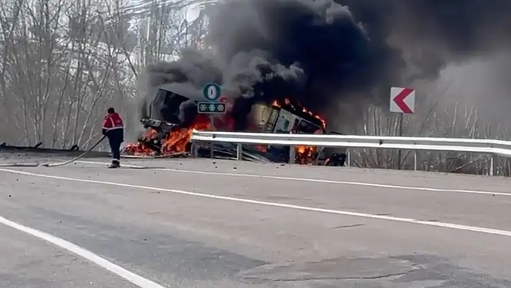 TIR devrildi, üzerindeki iş makinesi alev aldı 3 yaralı