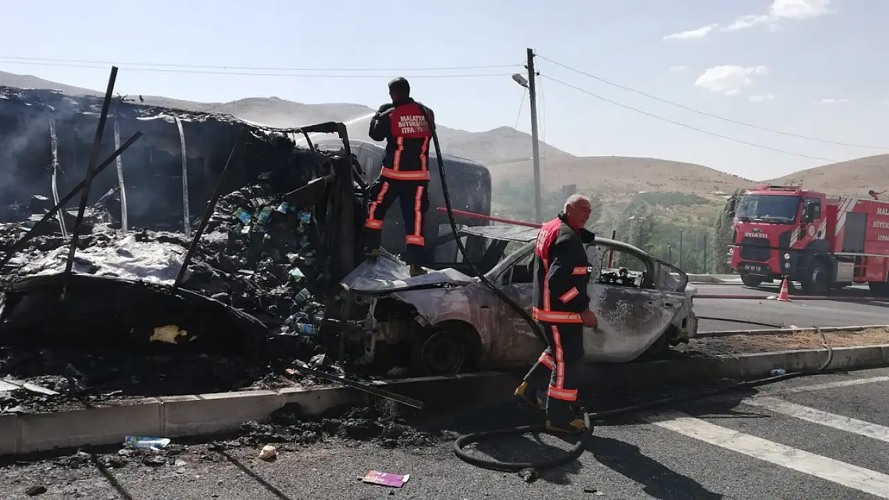 Malatya'nın Darende ilçesinde, TIR ile otomobil kafa kafaya çarpıştı, 5 kişi yaralandı. Kazada alev topuna dönen araçları itfaiye söndürdü.