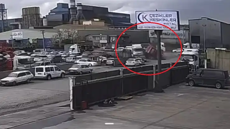 Osmaniye'de hurda yüklü TIR, yol kenarında park halindeki araçların üstüne devrildi. Kaza anı, güvenlik kamerasına yansıdı.