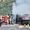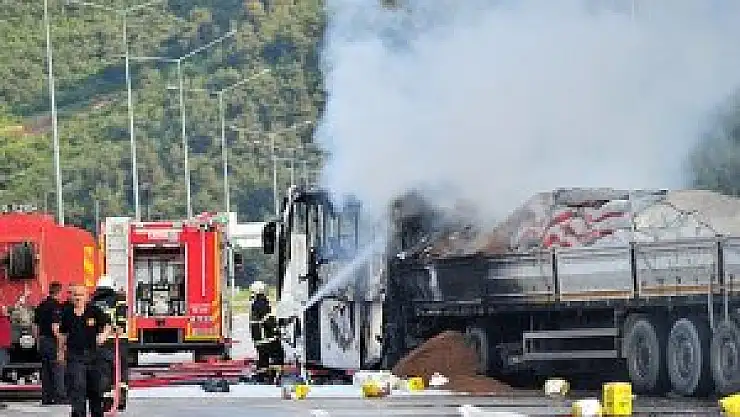 Gölbaşı mevkisinde İnegöl yönüne giden sıvı yağ tenekesi yüklü 16 HAK 79 plakalı tır, önündeki yolcu otobüsüne çarparak alev aldı.