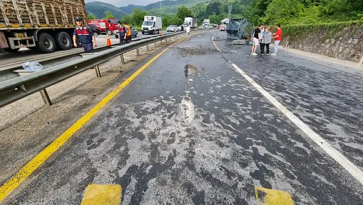 DÜZCE'de TIR'ın taşıdığı trafo, D-655 kara yoluna düştü. Düşen trafo nedeniyle yolun Zonguldak yönü, 2 saat boyunca ulaşıma kapalı kapandı.