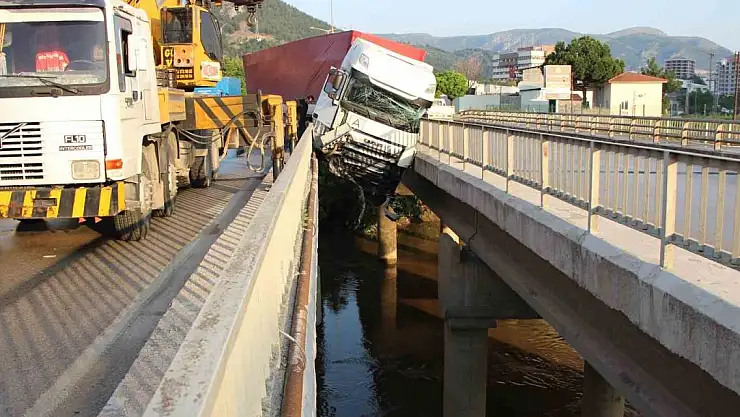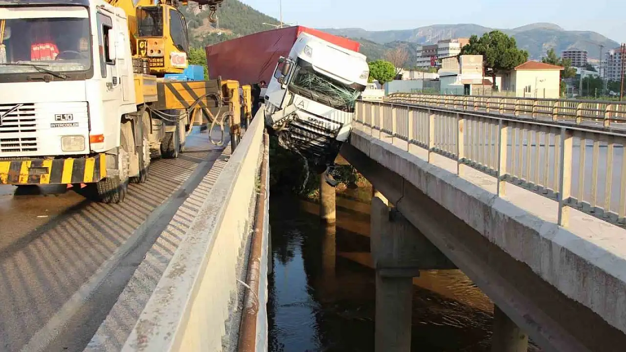 Amasya'da sürücüsünün kontrolünden çıkan tırı Yeşilırmak nehrine uçmaktan köprü korkulukları kurtardı. Tır, iki köprünün arasındaki boşlukta sıkıştı kaldı. Vatandaşlar kazanın gürültüsünü deprem sandı.