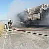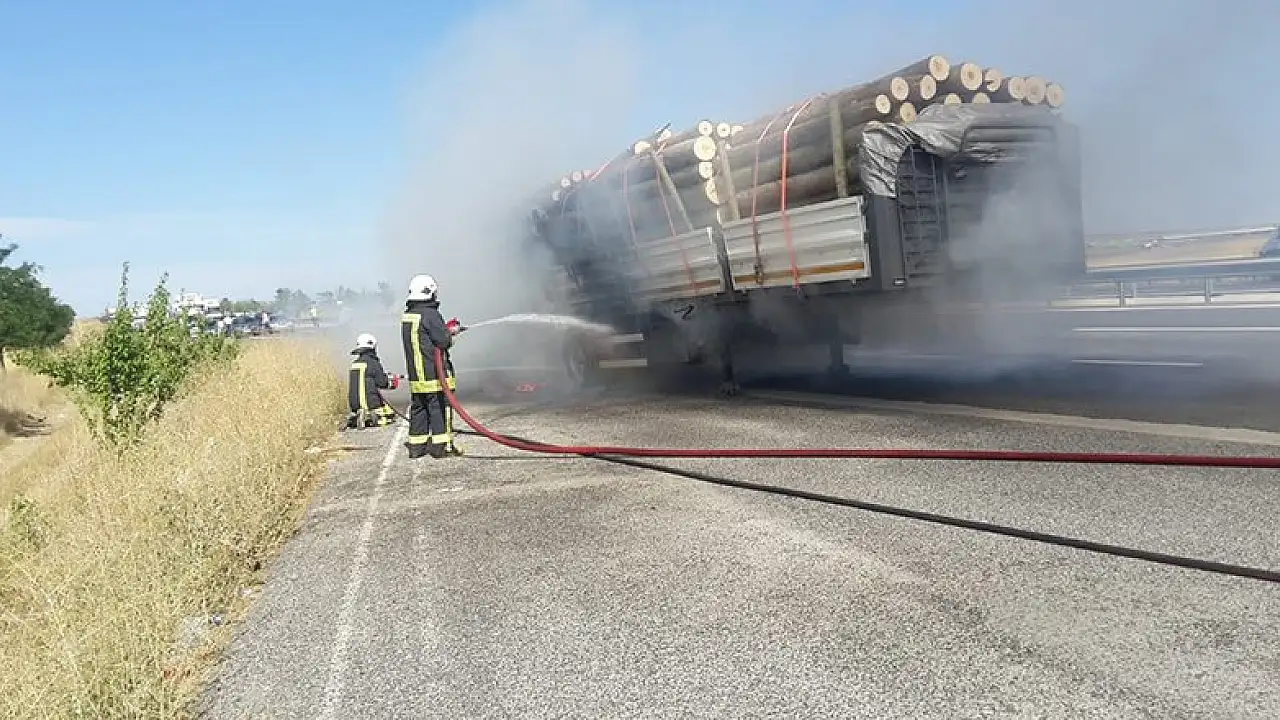 Konya'nın Kulu ilçesinde tomruk taşıyan tırın dorsesinde alev alan lastiği itfaiye ekipleri söndürdü