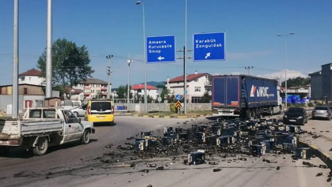 BARTIN'da kavşakta dönen TIR'ın dorsesinin yan kapakları açılınca, bira kasaları yola saçıldı.