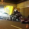 Başkent'te, hasarlı kamyon ve otomobil taşıyan TIR, köprüye takıldı. TIR'ın dorsesindeki otomobil yola düştü, kamyonun ise yarısı dışarıda yarısı TIR'ın dorsesinde kaldı.