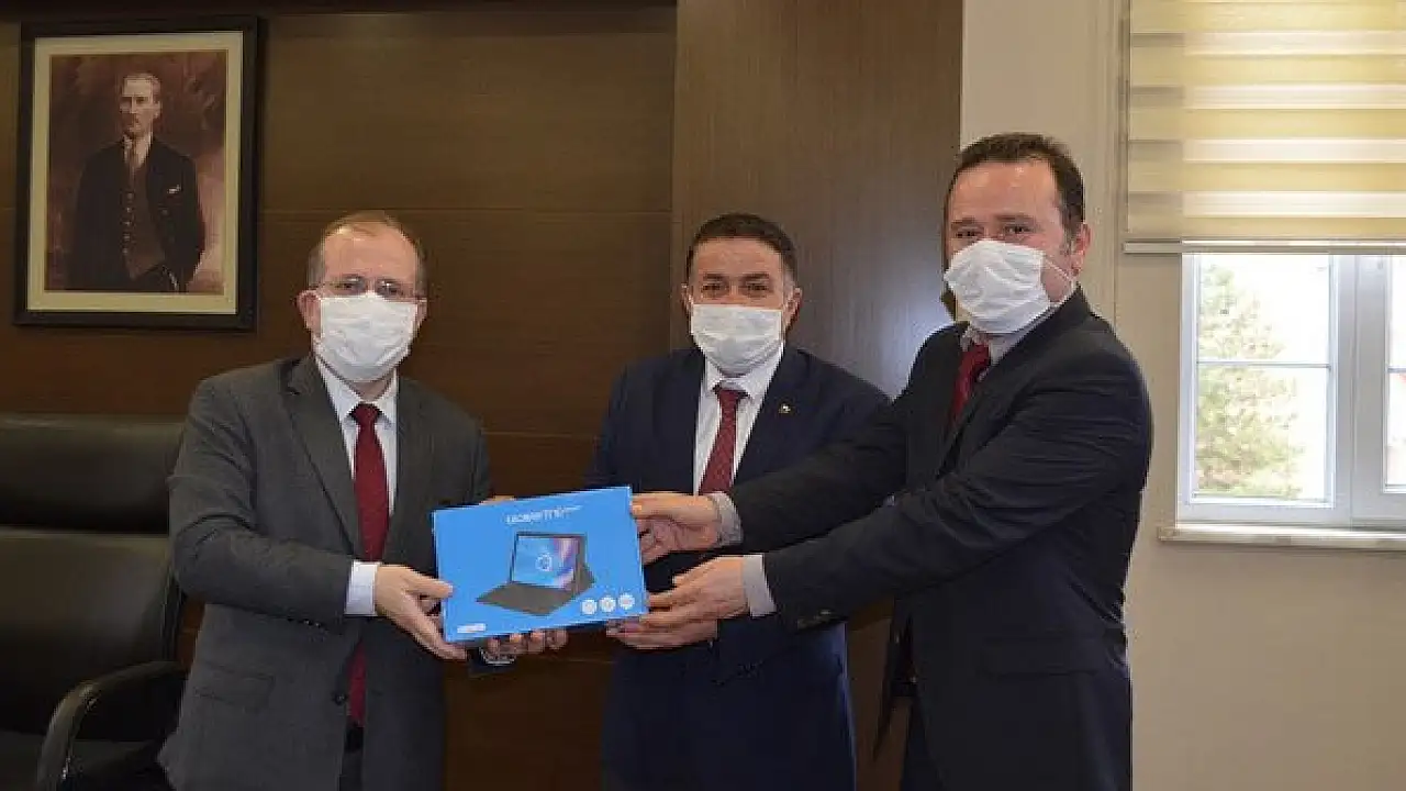 Özlen, 55 tableti İlçe Milli Eğitim Müdür vekili Ebubekir Akçakaya'ya teslim etti.