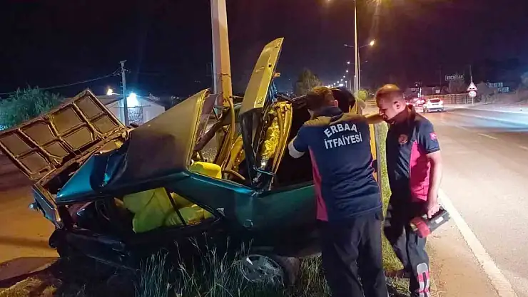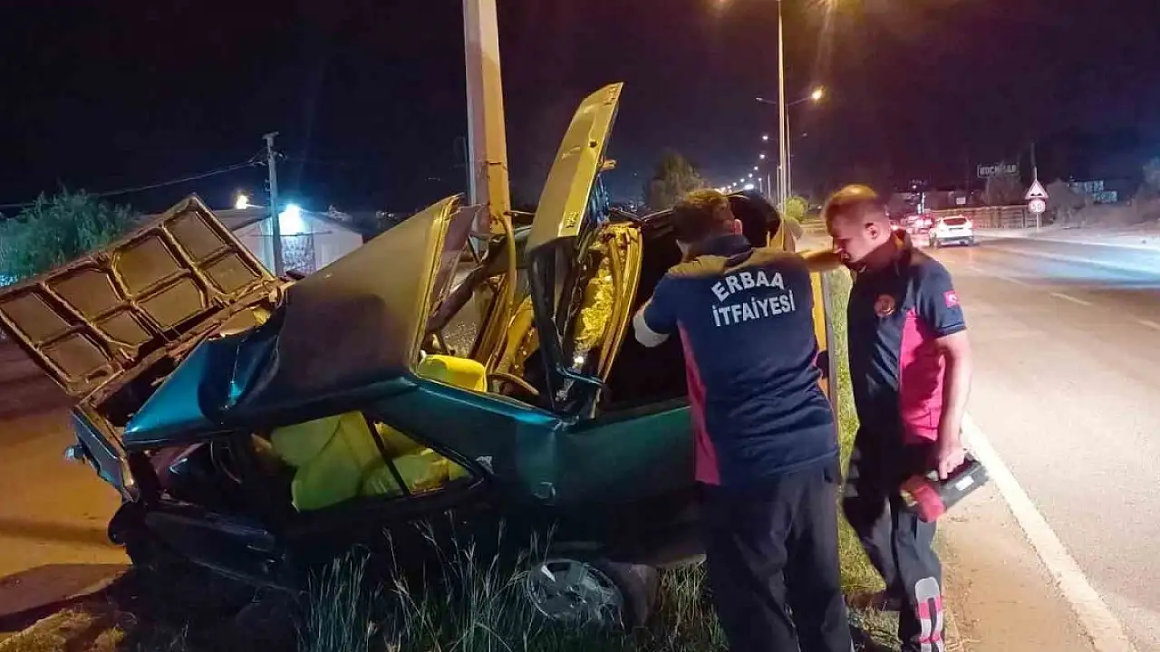 Tokat'ın Erbaa ilçesinde meydana gelen trafik kazasında, refüje çıkan otomobil aydınlatma direğine çarparak hurdaya döndü.