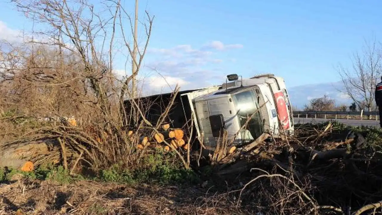 Tomruk yüklü kamyon devrildi, sürücünün burnu bile kanamadı